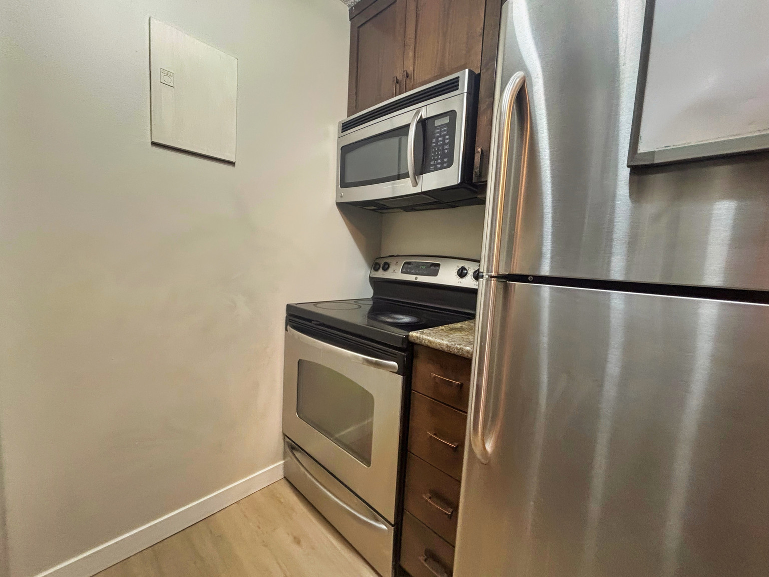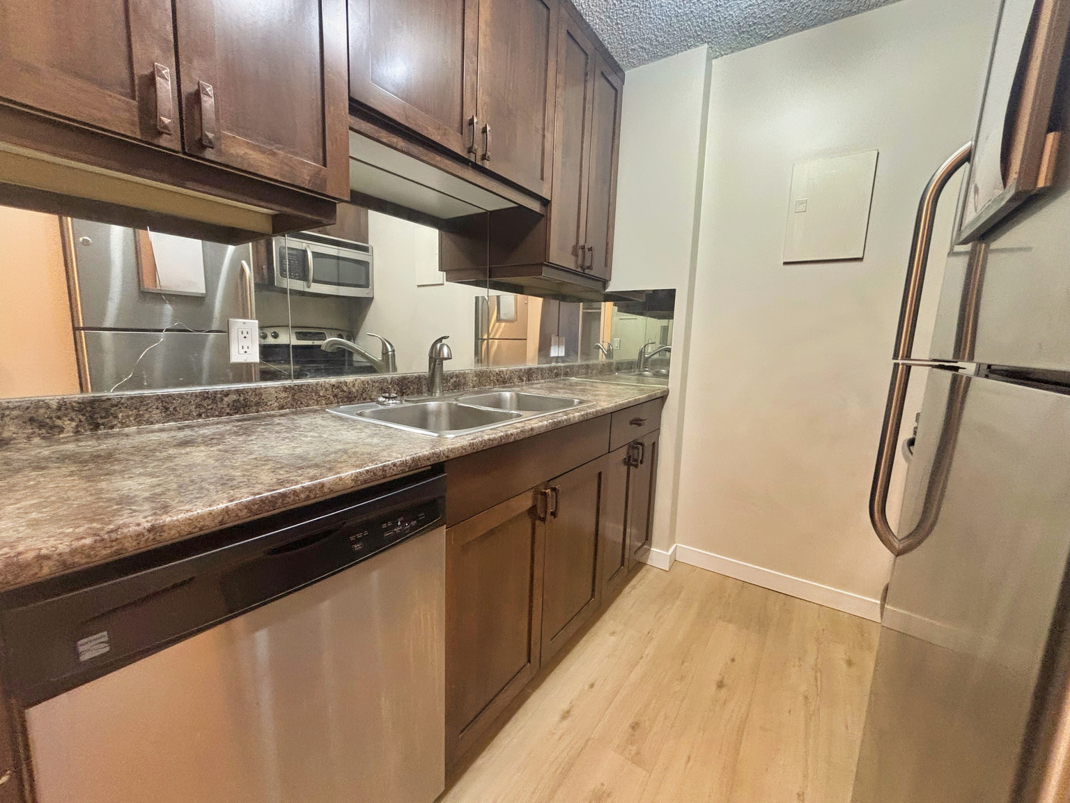 - The kitchen offers stainless steel appliances, newer cabinetry and laminate flooring throughout the condo.