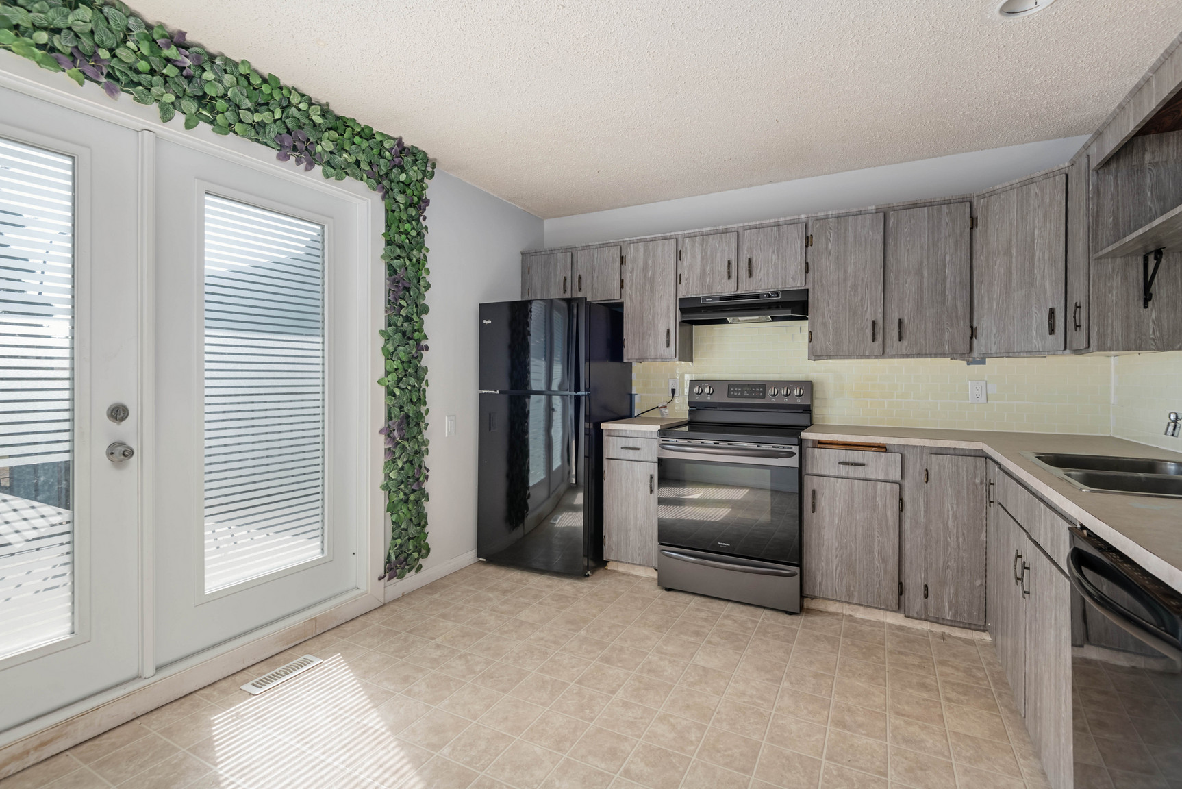 - Renovated kitchen with modern finishes and French doors leading to the deck